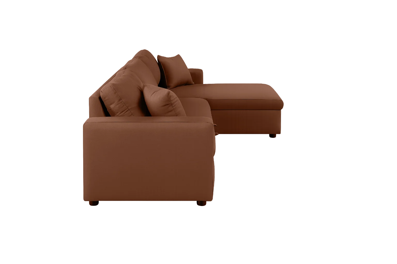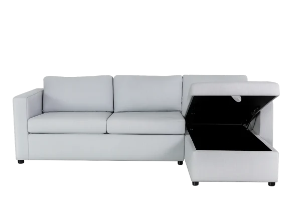 This 3-seater L-shaped convertible sofa bed featuring a built-in storage chaise. This design is highly common in modern urban apartments due to its multi-functional nature.