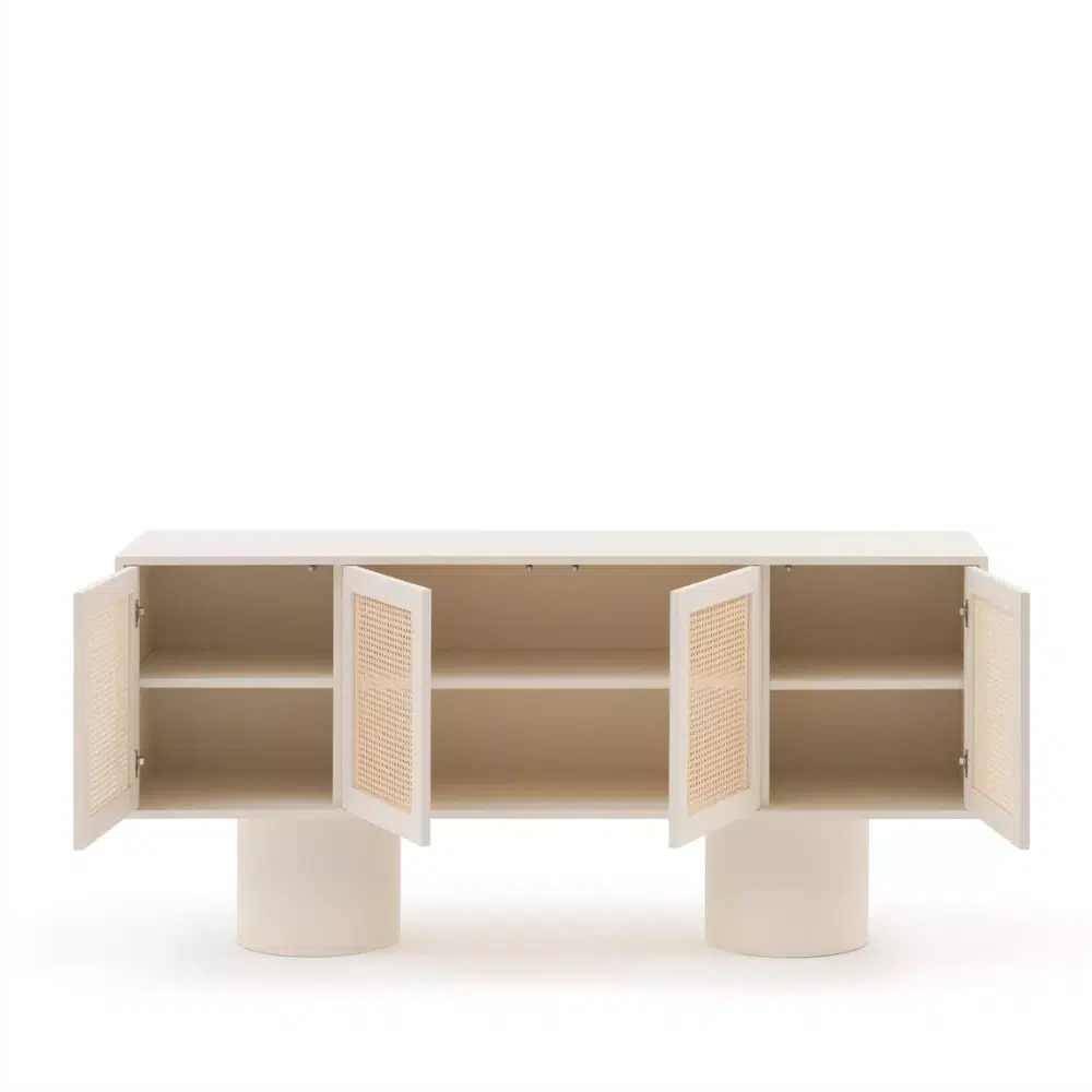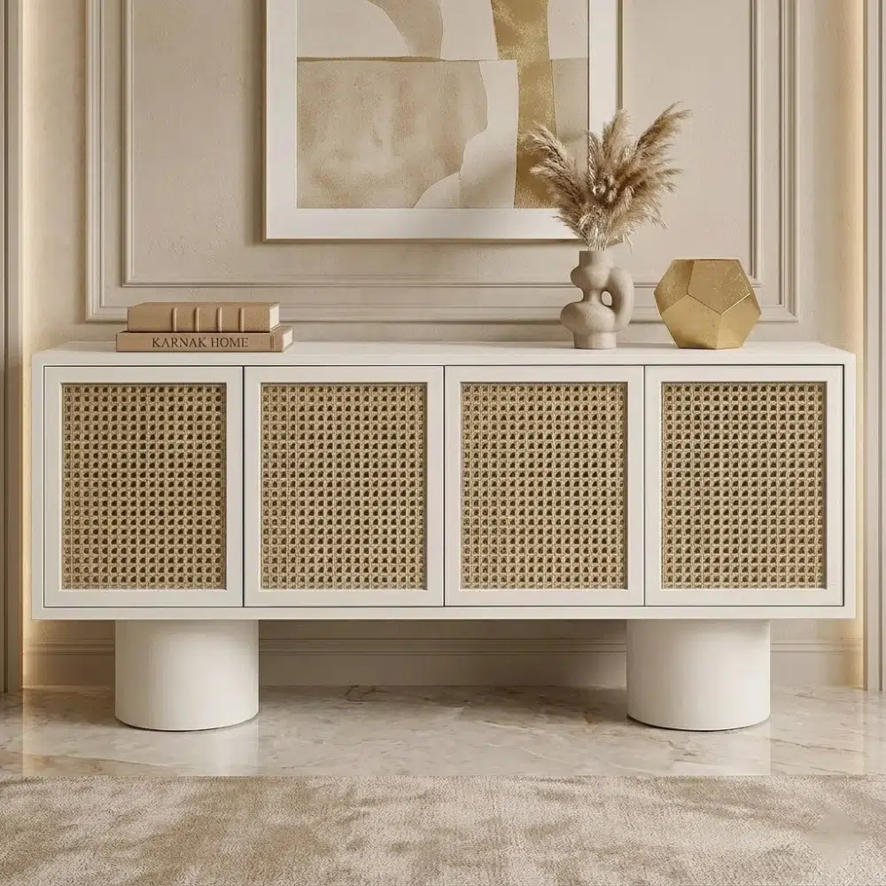 Experience the perfect intersection of architectural boldess and organic warmth. This isn’t just a storage piece; it’s a curated statement for the modern home. Hand-finished in a luxurious matte plaster and accented with precision-woven cane, the “Classic Comfort” buffet brings a serene, high-end gallery feel to your living space. 🏛️🌿
