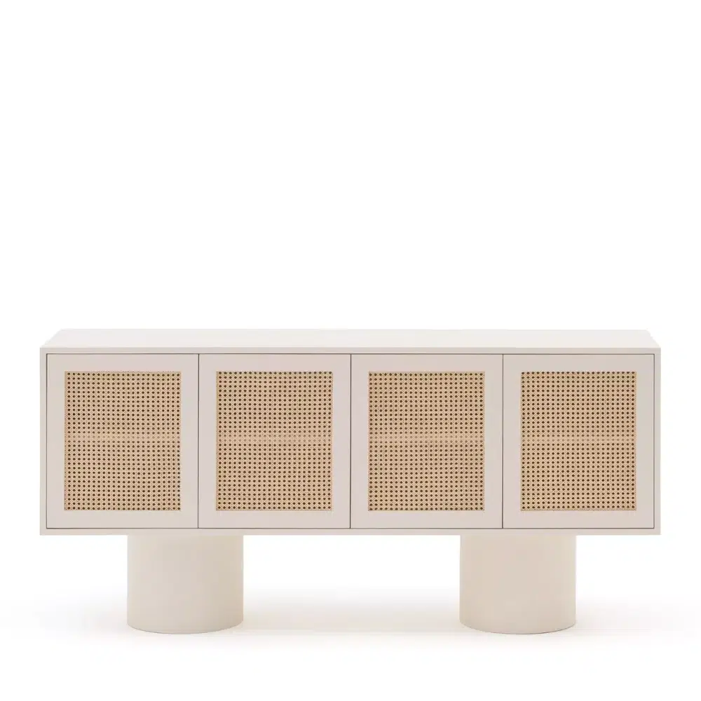 Elevate your interior with a masterpiece of Organic Modernism. This statement buffet blends the raw, tactile beauty of a matte plaster finish with the airy, timeless texture of natural cane webbing. 🌿