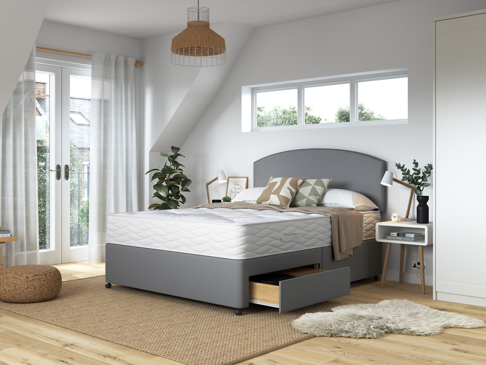 The divan base is upholstered in a modern grey fabric and includes built-in storage drawers, making it perfect for maximizing bedroom space. The set is completed with a matching curved headboard, adding a contemporary and elegant touch to any room.